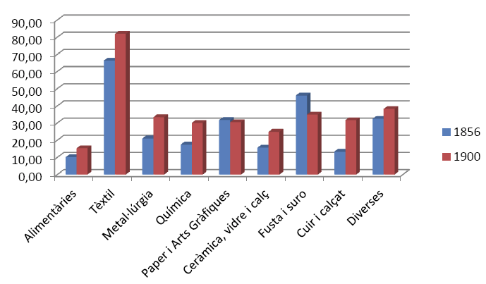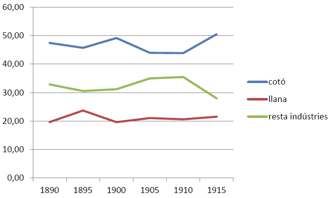En resum, de 1980 a 1915 el conjunt del sector tèxtil va significar a Catalunya entre el 65 i el 72% de l’index de producció industrial, amb oscil·lacions entre el cotó i la llana, mentre que la resta d’indústries se situava entre un 27 i un 32%. Entretant, Barcelona es definia com una gran ciutat industrial a escala europea.