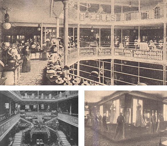 Els Grans magatzems eren els espais idonis per efectuar aquestes noves relacions comercials. Suposaven una nova idea de comerç, que aglutinava tot tipus d’objectes destinats a tot tipus de públics. Comptaven amb tallers de modisteria propis, dirigits per alguna modista de més renom, i s’encarregaven de tenir vestits i objectes de darrera moda, amb la diferència de que aquests ja no eren únics, sinó que s’havien produït en sèrie.